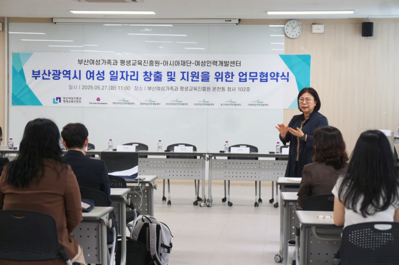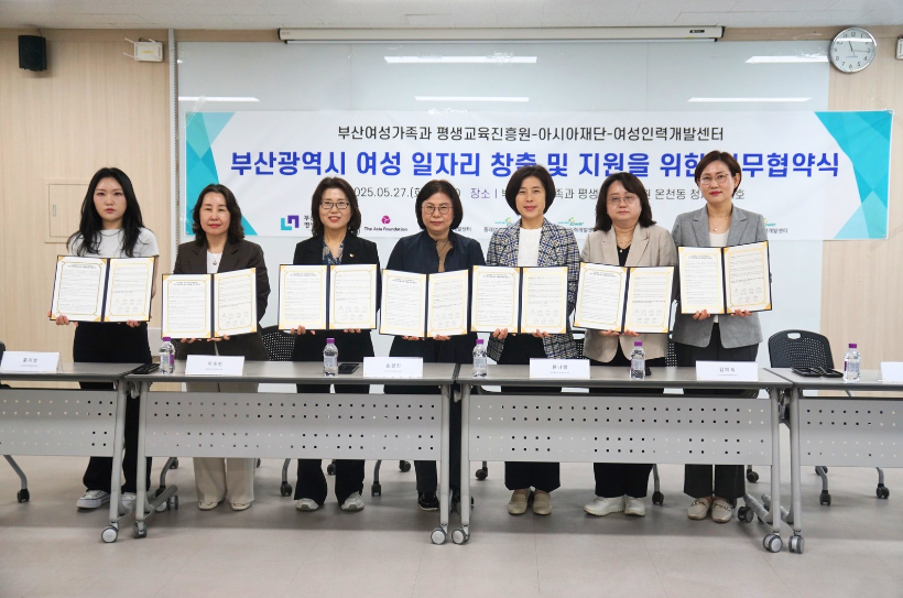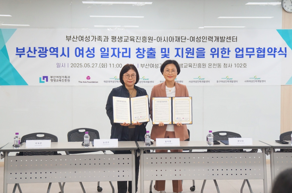 아시아재단은 2025년 5월 27일 부산여성가족과 평생교육진흥원(여평원) 및 부산 6개 여성인력개발센터*와 함께 부산 지역 여성 지원을 위한 업무 협약(MOU)을 체결하였습니다. ※ 해운대여성인력개발센터, 동래여성인력개발센터, 부산진여성인력개발센터, 사상여성인력개발센터, 동구여성인력개발센터, 사하여성인력개발센터