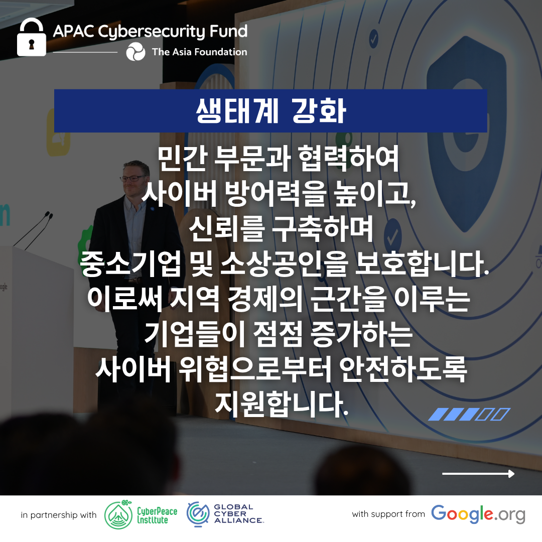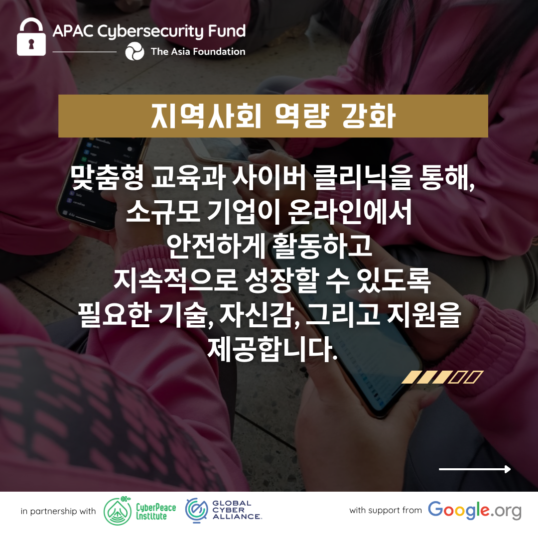 아시아태평양 지역에서 중소기업은 지역 경제의 근간을 이루고 있으나, 상당수가 성장에 위협이 되는 사이버보안 위험에 직면하고 있습니다. Google.org의 지원을 받는 아태지역 사이버보안 기금은 지역사회 구성원, 정책 입안자, 그리고 민간 부문과 협력하여 지역 전반의 디지털 회복탄력성을 강화하고 있습니다.